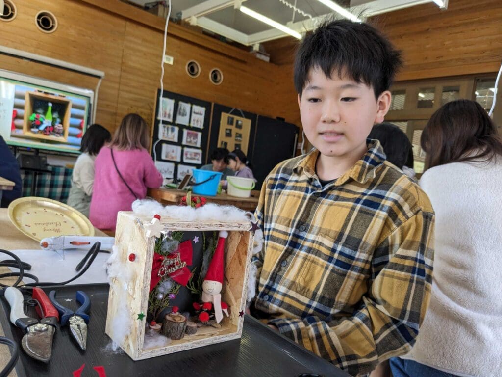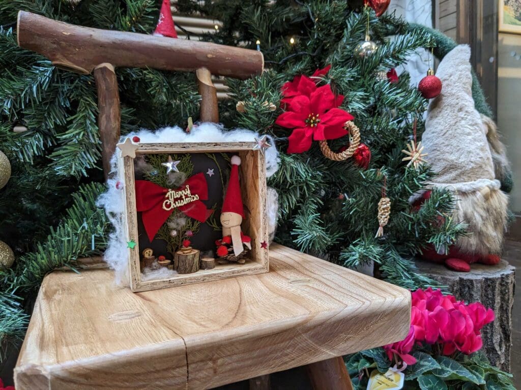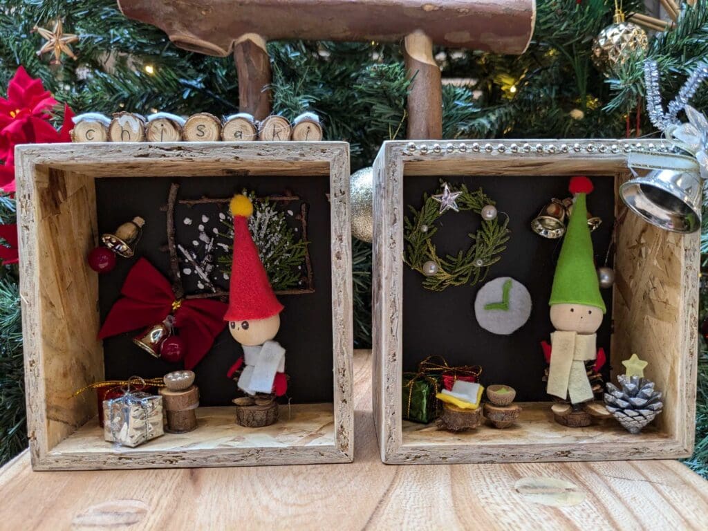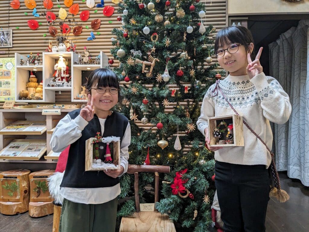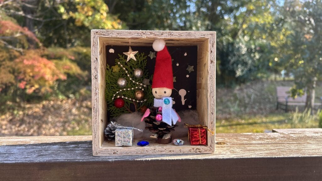 デンマークの妖精ニッセは子供や家を守り、サンタクロースのお手伝いをしたり、住む家に幸せを招くと言われています。今回は松ぼっくりや枝を使って、ニッセと箱庭を作り、楽しいクリスマスを迎えましょう!(寸法:15cm×15cm)