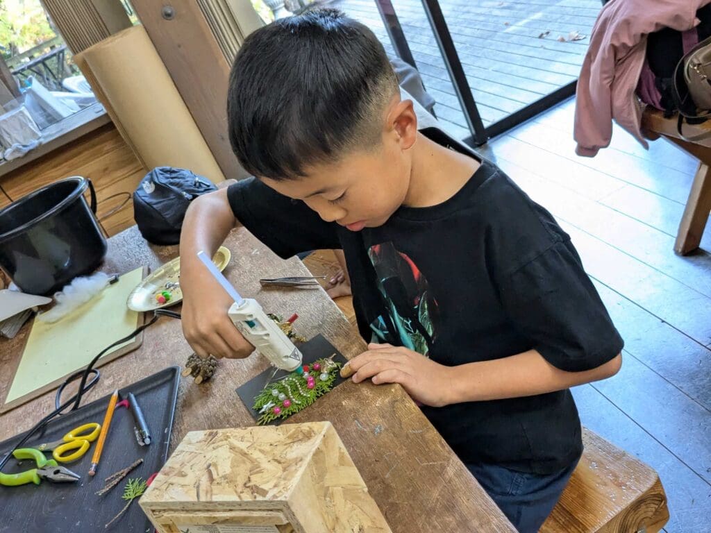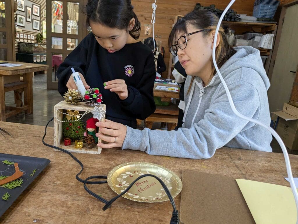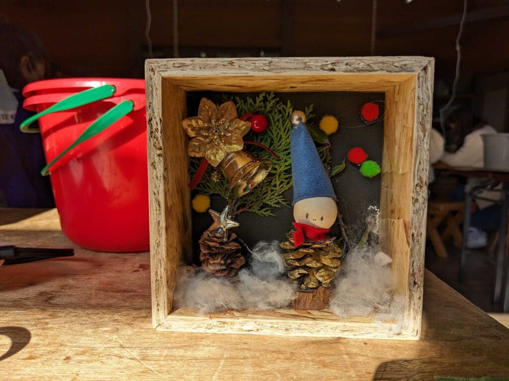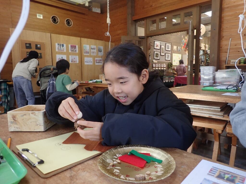 デンマークの妖精ニッセは子供や家を守り、サンタクロースのお手伝いをしたり、住む家に幸せを招くと言われています。今回は松ぼっくりや枝を使って、ニッセと箱庭を作り、楽しいクリスマスを迎えましょう!(寸法:15cm×15cm)