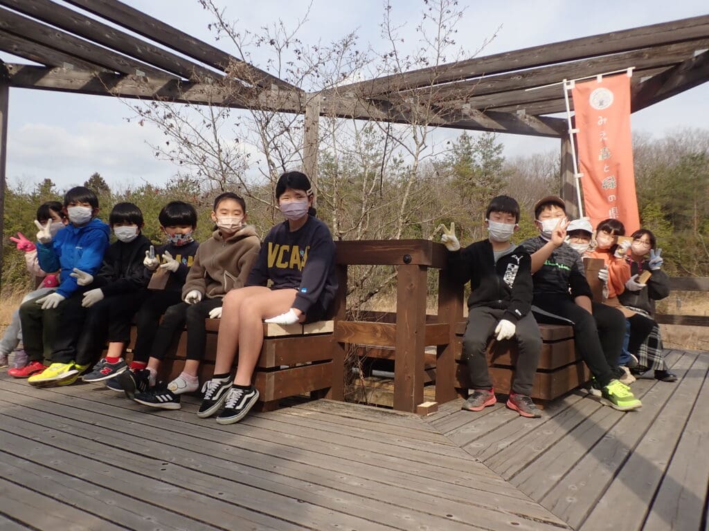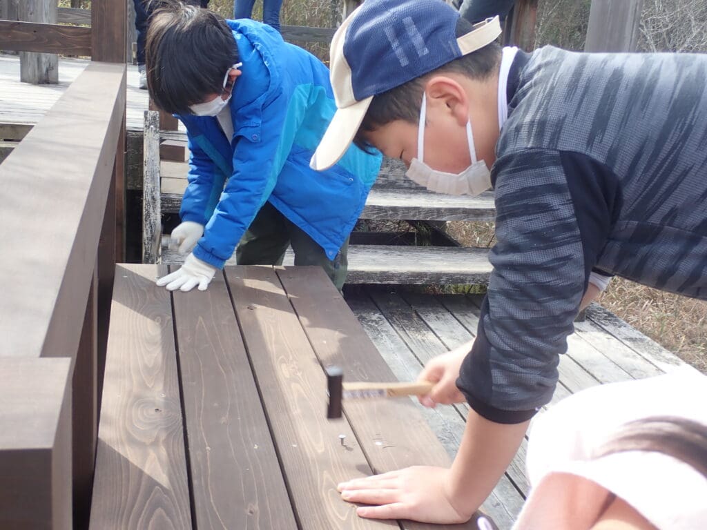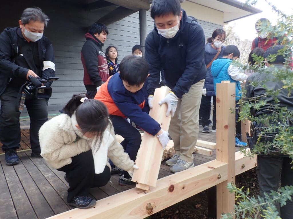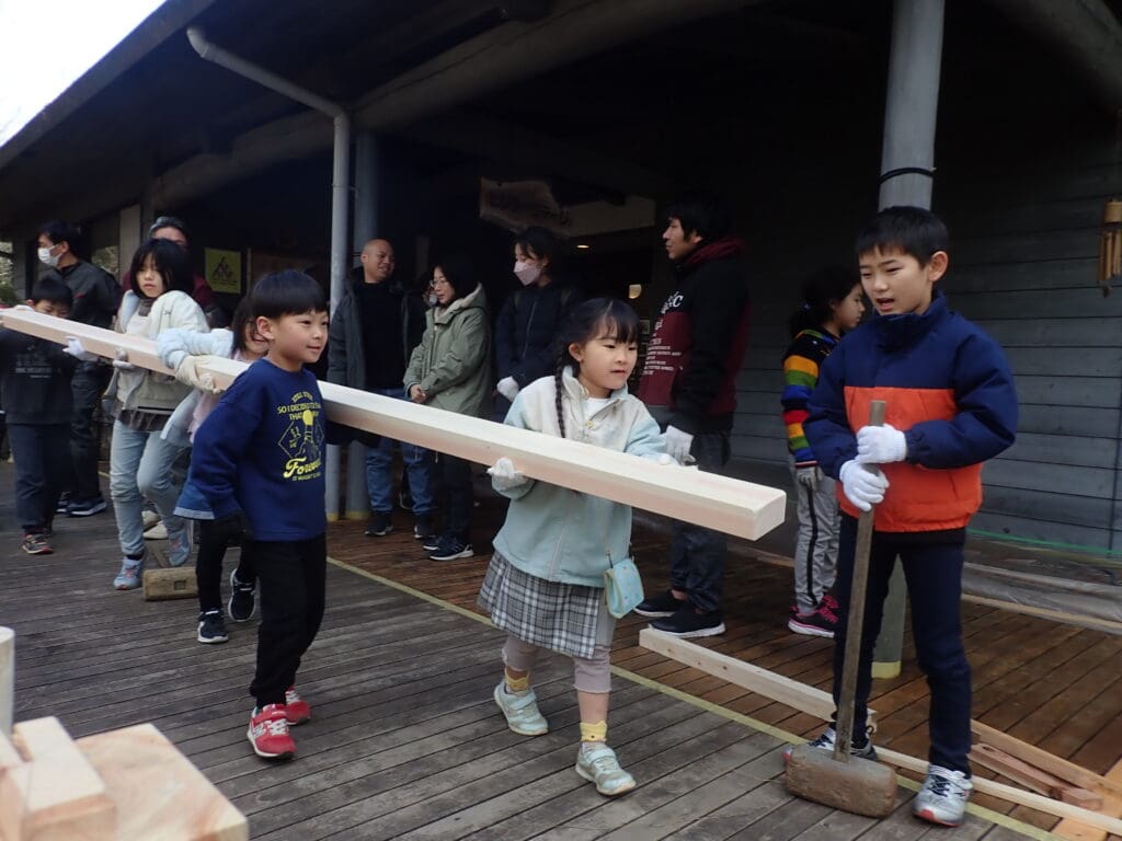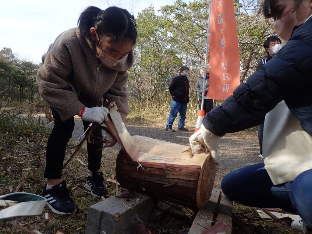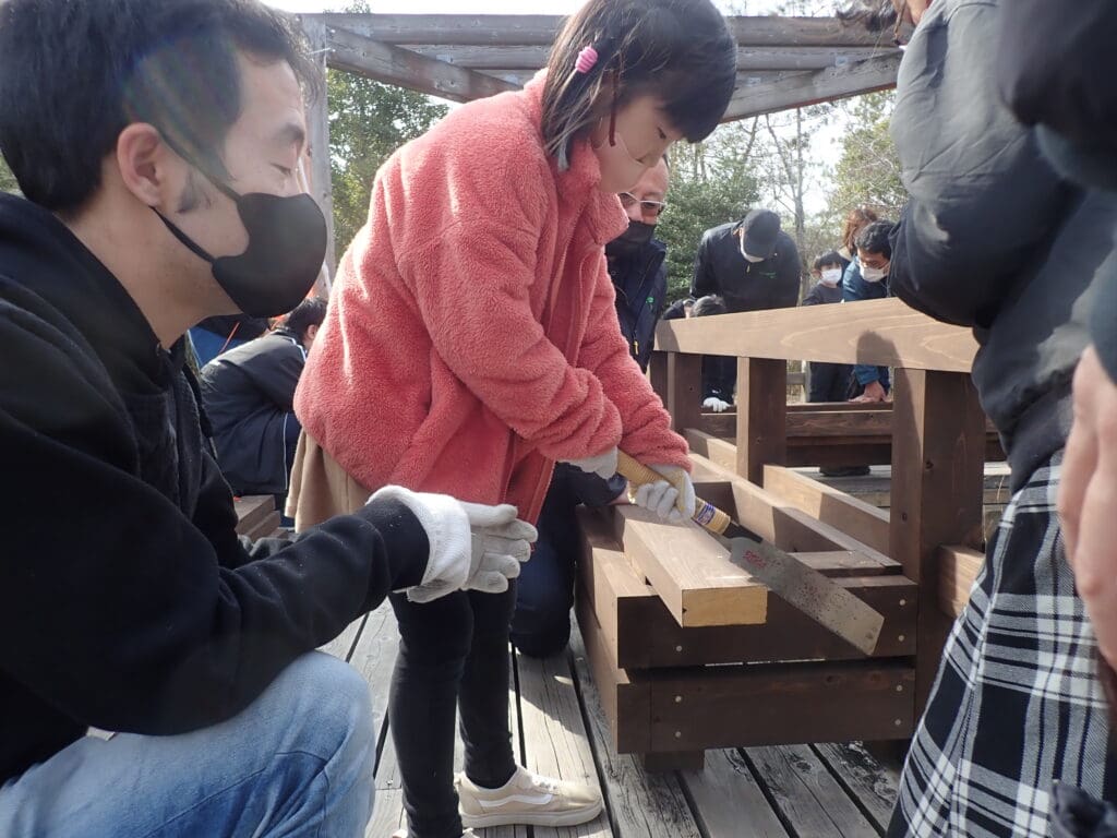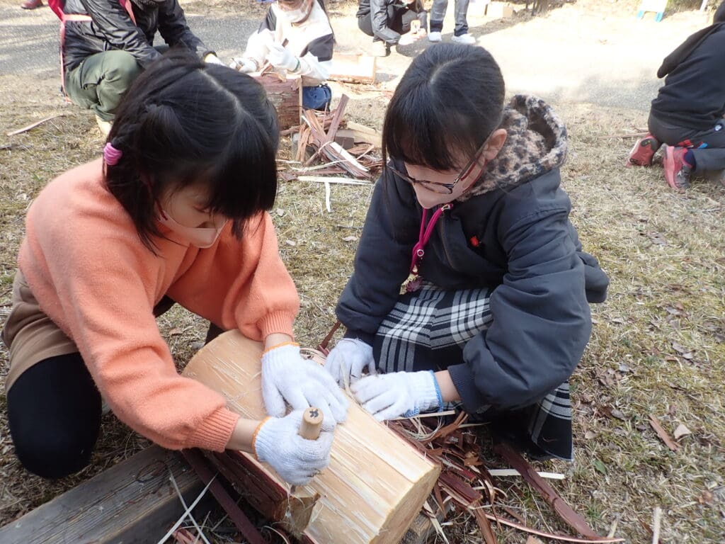 ひだまりの丘に設置するテーブルセットと木柵を、みんなで協力して作ります。ヒノキの皮むきも体験しよう。