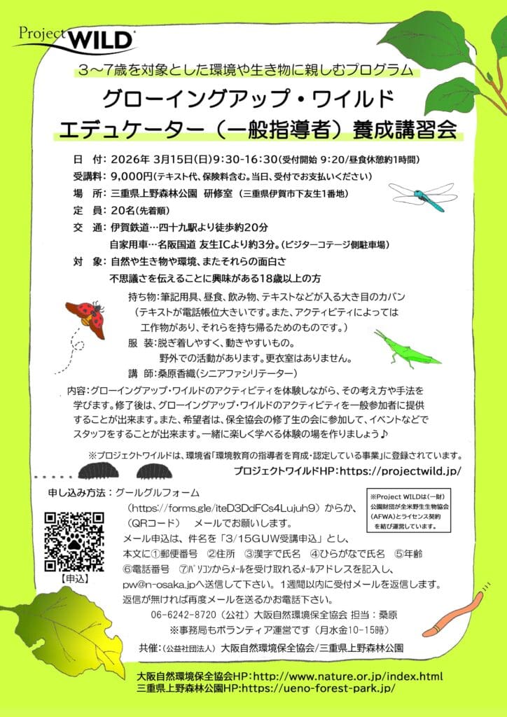 3/15(日)三重県上野森林公園でProject WILD(プロジェクトワイルド)グローイングアップ・ワイルドエデュケーター養成講習会 を開催します。