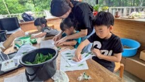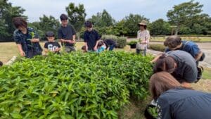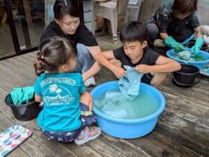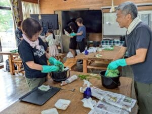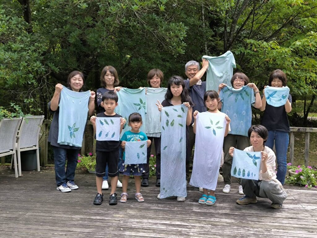 花のテラスで育てた藍の葉っぱを摘み取るところから始め、参加者各自で用意した布を染め上げます。
