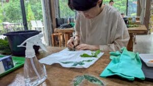 こすり染め(たたき染め)で葉っぱの模様をつけ、生葉染めで全体を青く染め上げました!