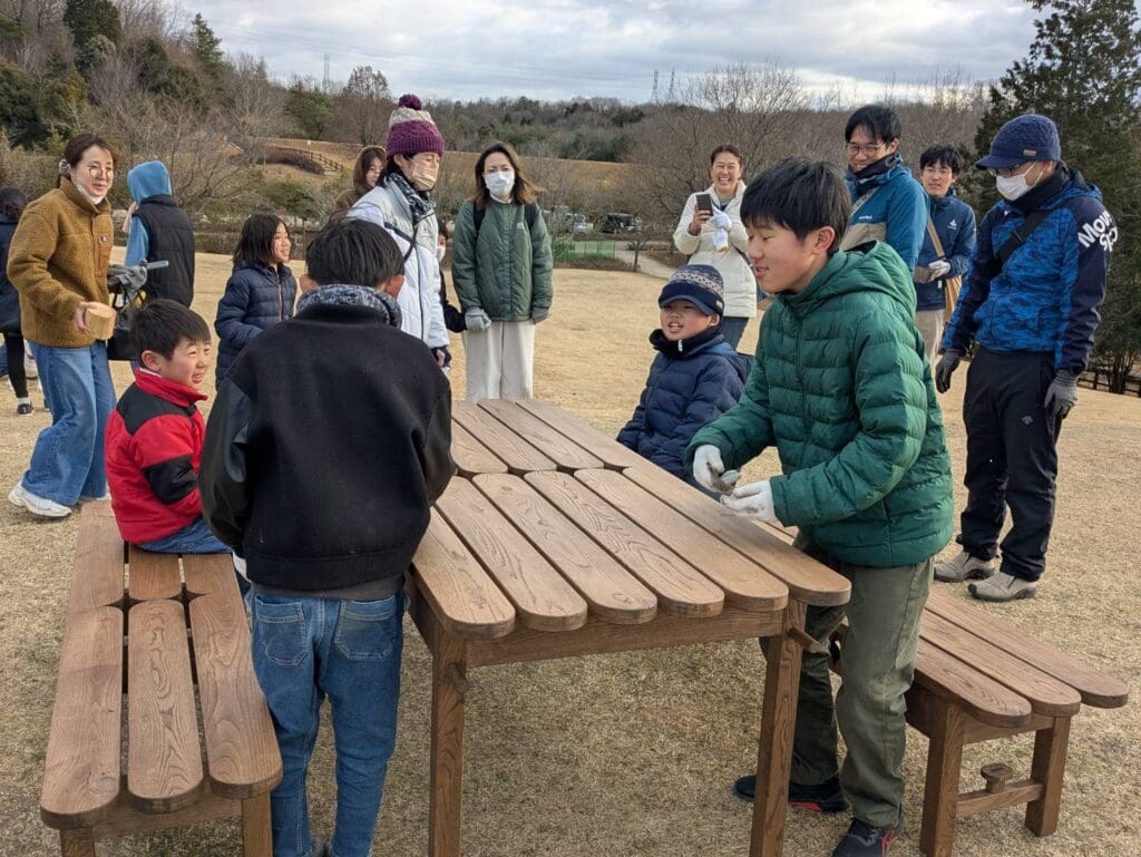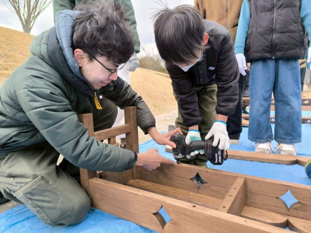 その後、プロの大工さんに道具の使い方を教わりながら、公園に設置するウッドフェンスとテーブルセットをみんなで協力して製作。