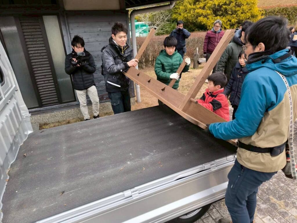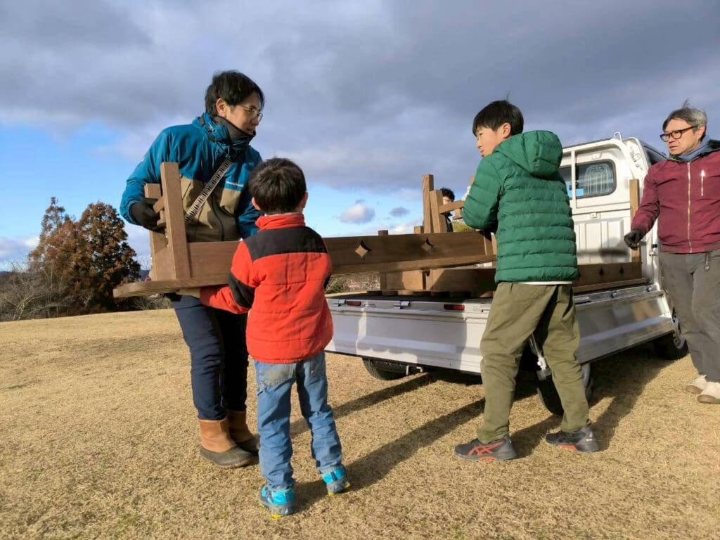 出来上がったテーブルセットをみんなで軽トラに積み込み、陽だまりの丘へ。