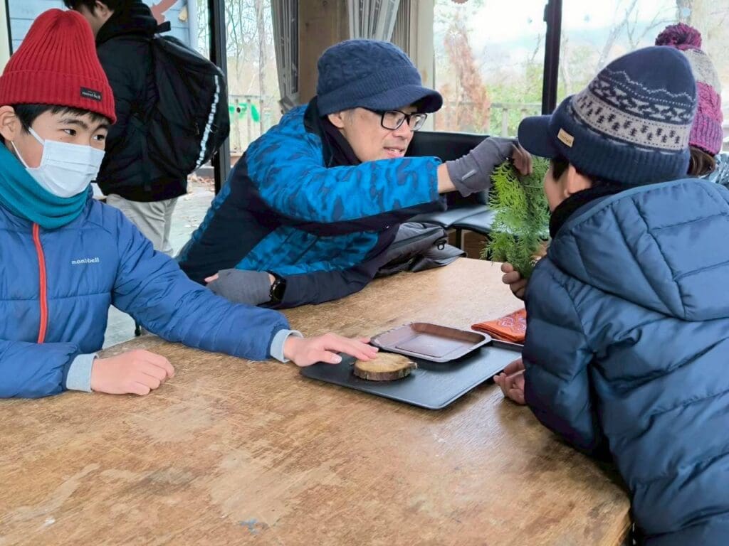 園内に生えているヒノキの葉っぱに触れ、香りをかいだり、ヒノキ林を観察し、生きた木が木材となり自分たちの生活に利用されていることを学びました。