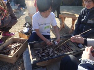 参加者のみなさんには、燃やすたき木を集めてもらうところから体験していただきました。