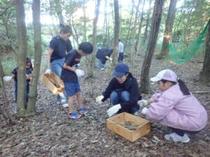 森の中から、燃えやすそうな落ち葉や小枝を拾い集めます。
