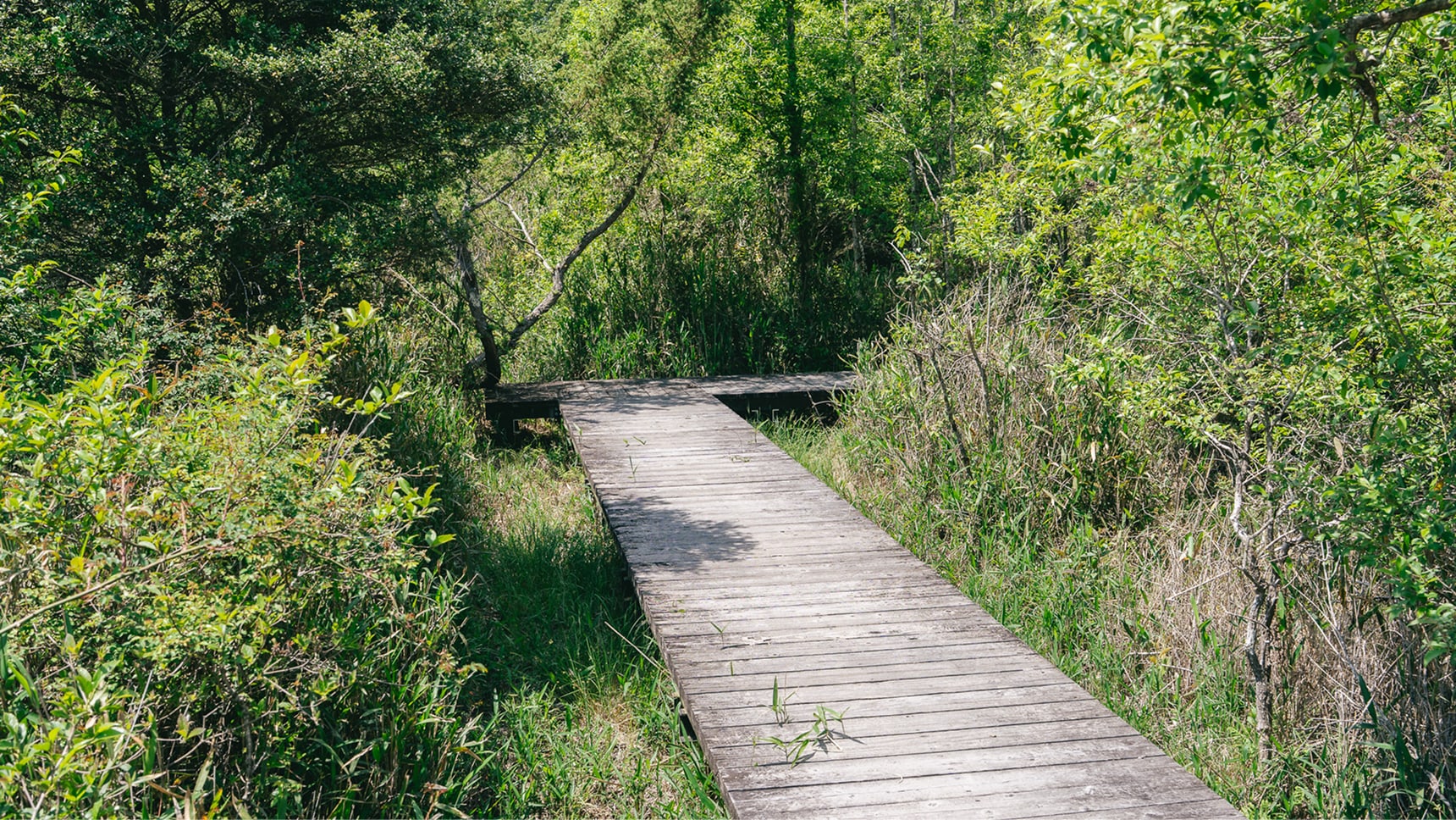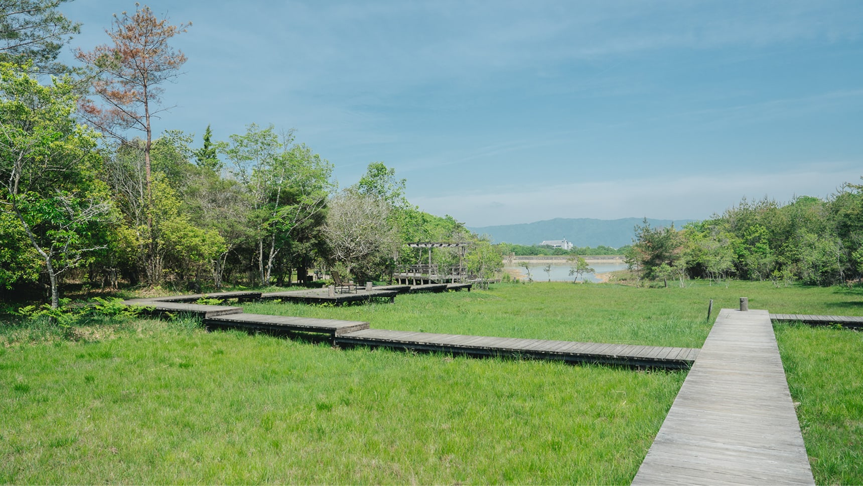 コナラやアカマツ、ソヨゴなどの二次林が広がる明るい森を抜ける舗装路や、ため池や湿地を抜ける開放的な景観を楽しめる木道、野生動物の足跡も観察できる登山道のようなちょっとワイルドな地道といった多様な散策路が整備されており、四季折々の変化を感じながら散策できるのが魅力です。